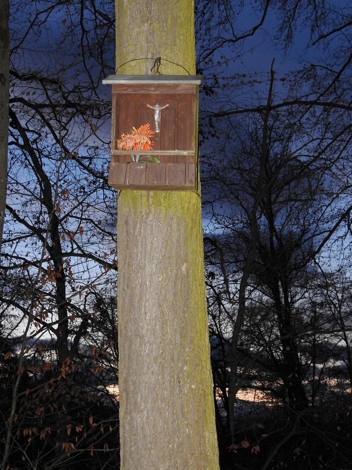 Beschreibung: Es handelt sich um ein sehr kleines Holzmarterl mit einem Kruzifix im Inneren und der Möglichkeit, kleine Blumenvasen einzustellen. Das Kruzifix besteht aus einem einfachen Holzkreuz, mit metallener Skulptur des Gekreuzigten.