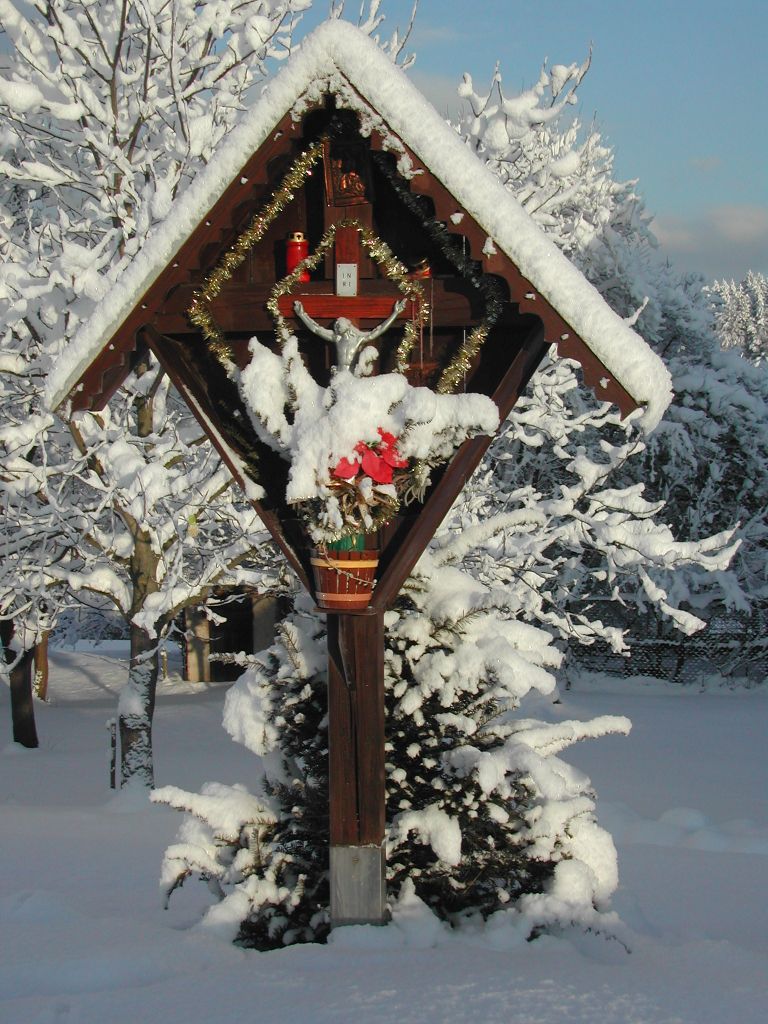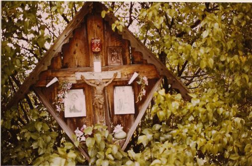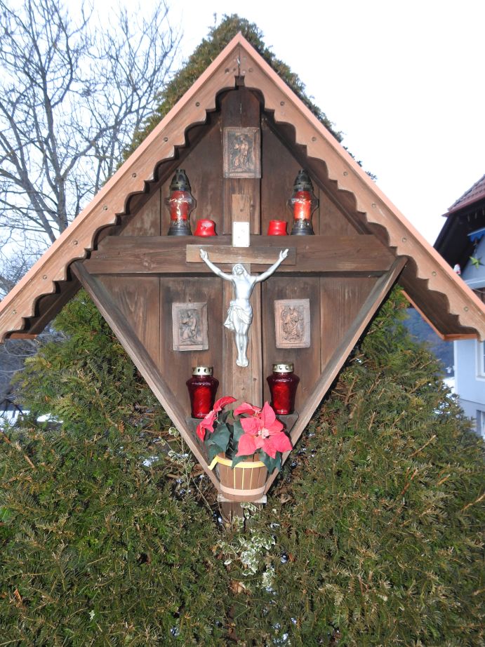 Beschreibung: Holzkreuz mit Dach und drachenviereckförmiger Rahmen mit Rückwand. Die Kreuzbalken des Kreuzes sind breit genug, dass Kerzen abgestellt werden können. Im unteren Bereich des Rahmens sind zusätzlich Abstellmöglichkeit für Kerzen und Blumenstock. Am Kreuz befindet sich ein Kruzifix, wobei die Kreuzbalken aus Holz in gleicher Farbe sind und die Christusfigur silber angemalt ist. Über dem Kruzifix und beidseitig davon sind einfärbige, holzbraune Reliefbilder aufgehängt.