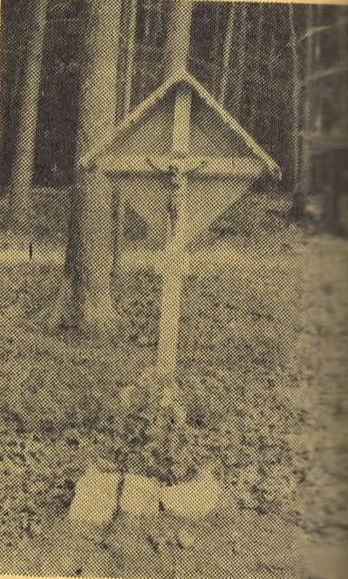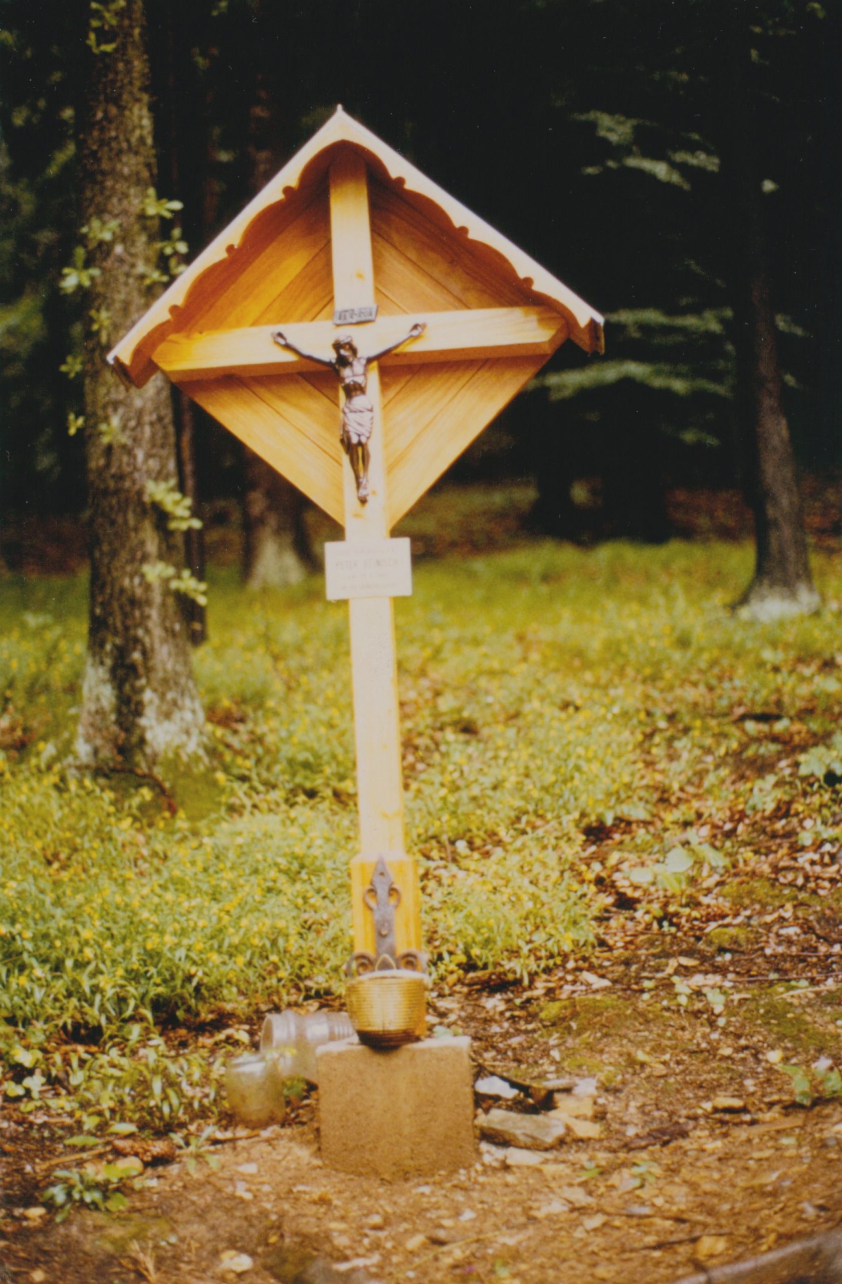 Beschreibung:  Holzkreuz mit Dach und quadratischem Hintergrund und metallener Christusfigur. Eine helle Tafel gibt den Grund der Aufstellung an: “Hier verunglückte Peter Reinisch am 29.8.1982 im 36. Lebensjahr“.